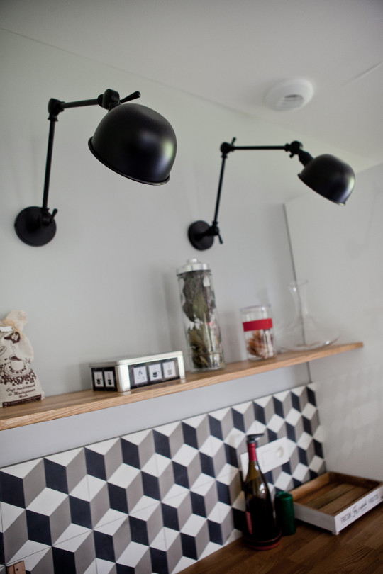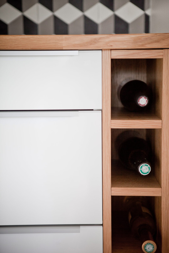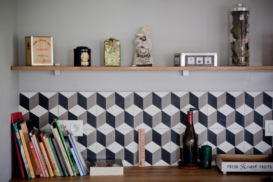La symétrie parfaite des éléments lui confère un esprit très graphique, souligné par un motif géométrique en carreaux de ciment pour la crédence.