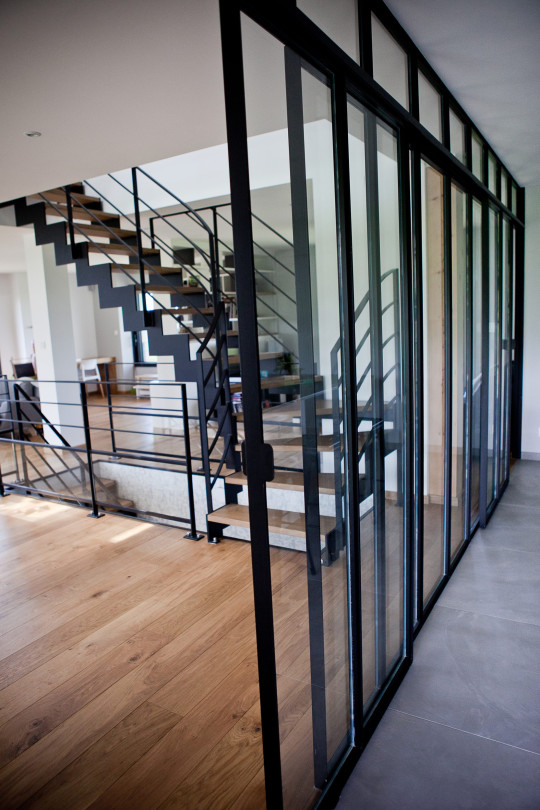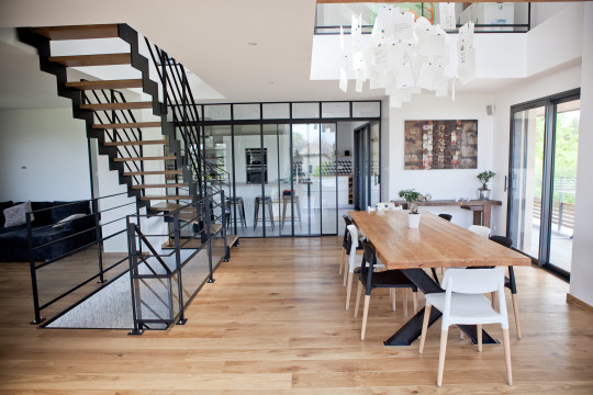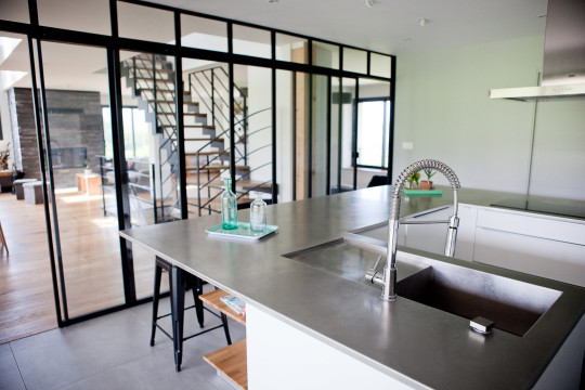 Enfin, une verrière de 5 mètres vient complètement nicher la cuisine derrière un paravent de verre, où 2 portes coulissantes viennent en toute discrétion laisser une circulation libre et fluide .