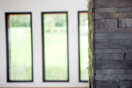 Côté cheminée, les matériaux bruts ont été privilégiés et de larges plages à hauteur des fenêtres s’étendent de part et d’autre, créant des rangements à bûches et un espace bureau.