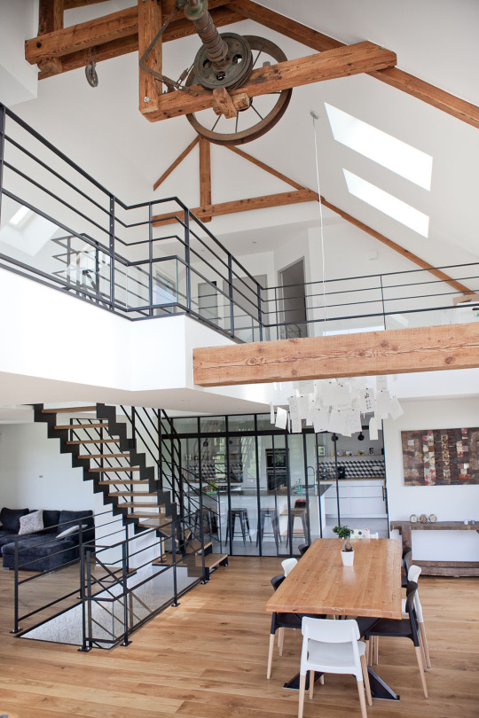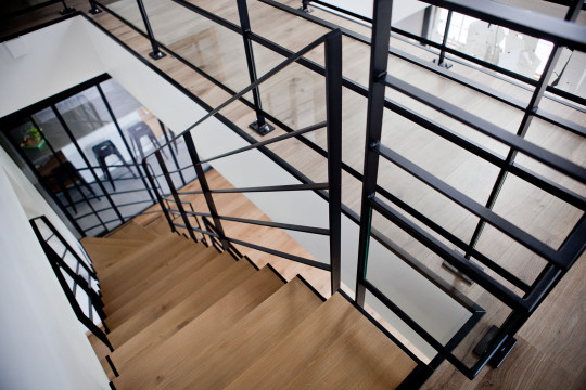 La circulation se fait autour d’un escalier, élément central de la maison, toute en transparence, et à l’esthétique profondément industrielle.