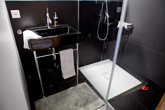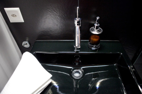 On joue la carte du noir absolu, avec une vasque ton sur ton posée sur un piètement alu (DURAVIT) et sa robinetterie STARCK.