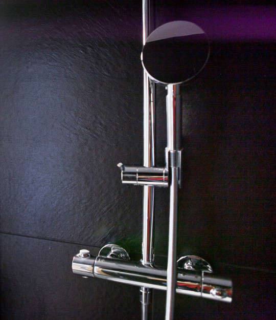 La petite salle de bain attenante, volontairement très design, s’est vue recouverte d’un carrelage effet « croute de cuir » pour un effet subtil et surprenant.