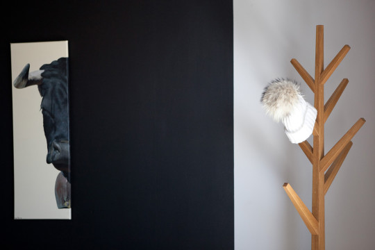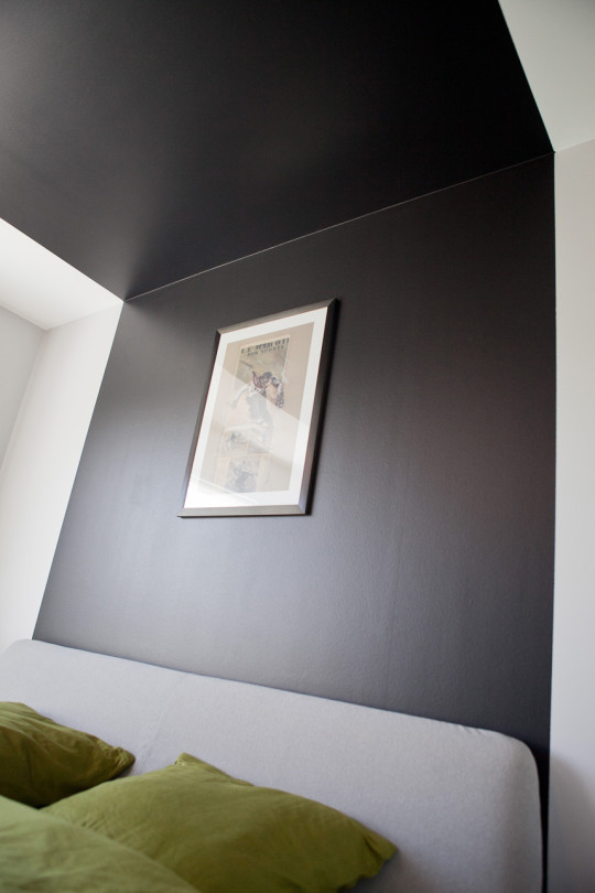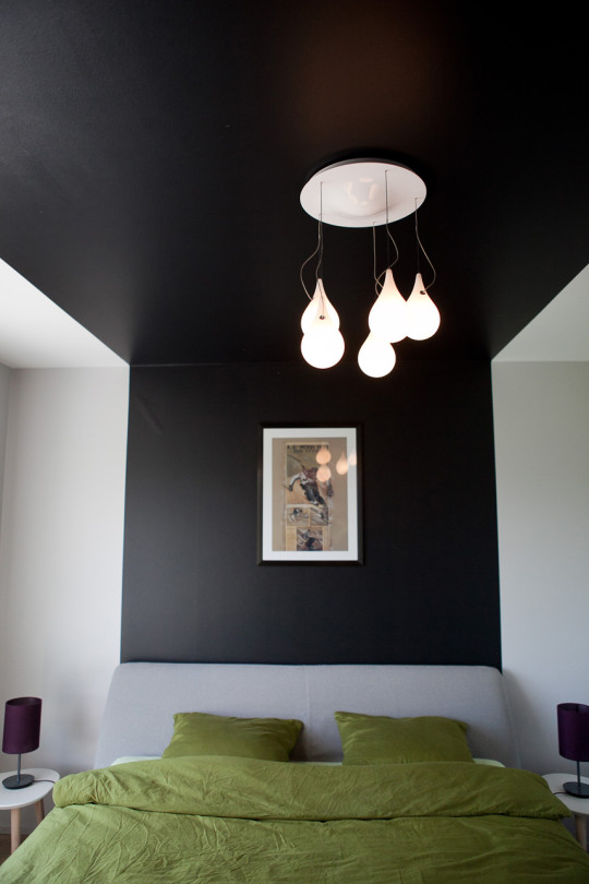 Dans la chambre principale, un tunnel de peinture noir mat a été créé pour structurer la pièce. Il joue le rôle de tête de lit et d’espace d’exposition. Il permet également de sublimer une très jolie suspension, formée de gouttes tombant du plafond. (Série « liquid » de chez NEXT).