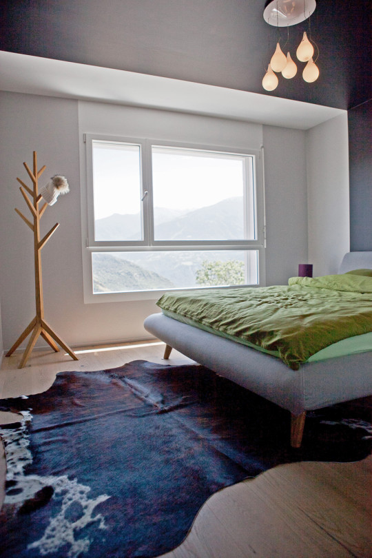 Un lit en feutrine (INTERIO) apporte une ambiance cosy à la chambre. La peau de bête au sol et le porte-manteau jouant les sapins, vient nous rappeler que ce soir, on dort à la montagne !!