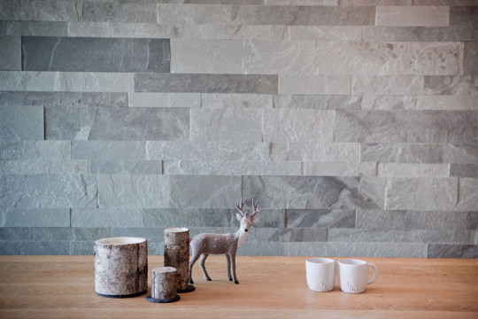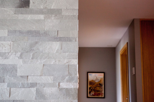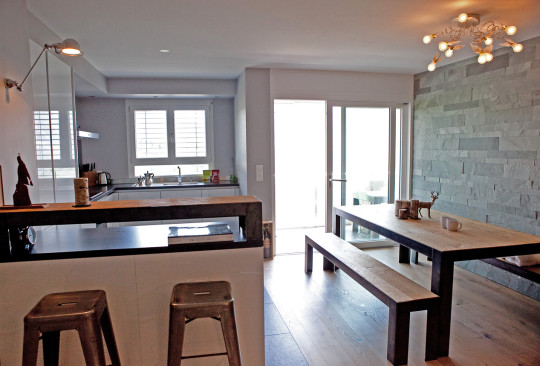 Une pierre horizontale type Lauze vient recouvrir tout un angle de l’appartement, venant délimiter visuellement le coin repas. Celui-ci est composé d’une grande table et de ses 2 bancs en vieux bois et métal, réalisé à la demande par un artisan local.