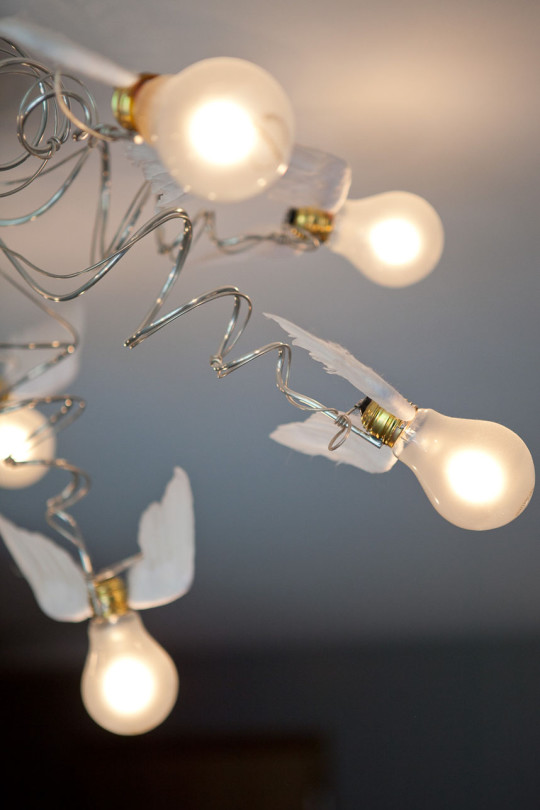 Un lustre composé d’ampoules ailées de chez INGO MAURER, amène sa touche poétique et onirique au tableau.