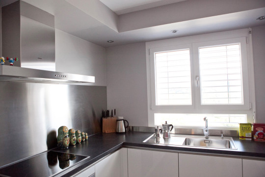 Une cuisine design sans poignées vient, dans ses façades laquées, refléter la lumière et le paysage environnant.