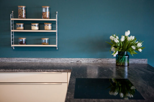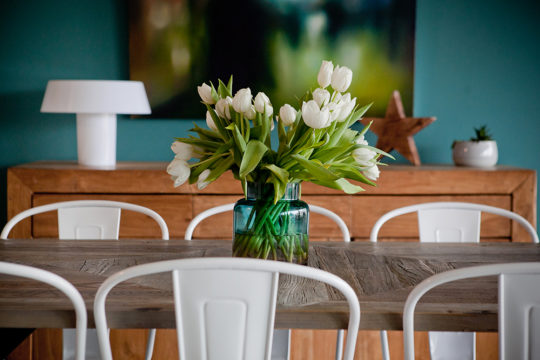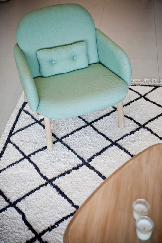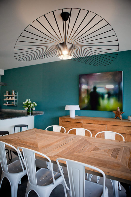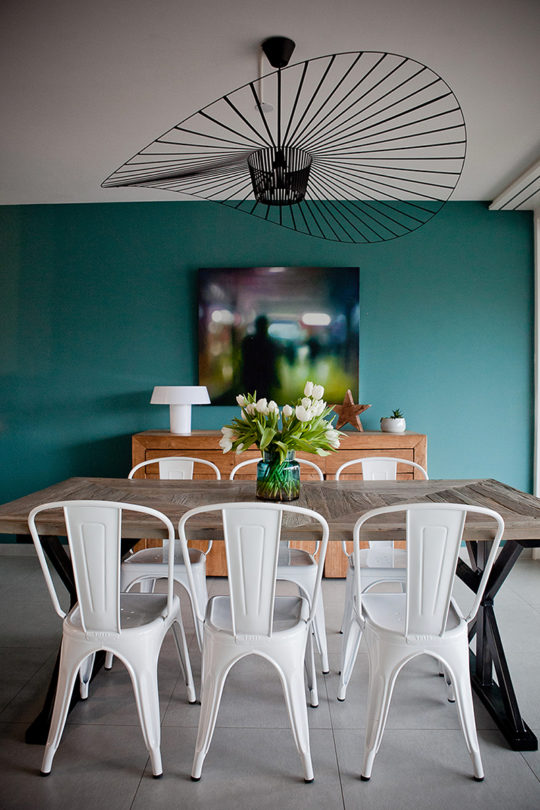 Dans la pièce de vie, l’humeur est calme et joyeuse grâce à ce mur bleu paon. Le mélange de style comme je les aime est à l’honneur. Table « campagne », chaises industrielles, canapé et fauteuil scandinaves, tapis berbère, tout se marie harmonieusement pour créer une ambiance délicate et personnelle.