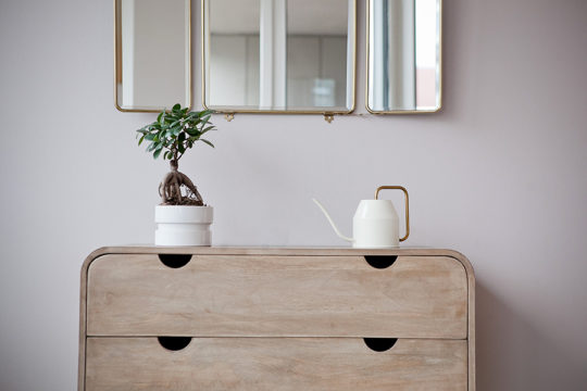 Dans la chambre, c’est la douceur qui prime. Un mur beige rosé la transporte dans un univers feutré. L’association avec du bois clair et du laiton apporte une touche d’élégance.