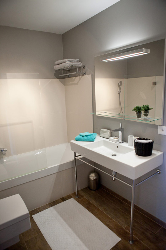 La seconde chambre de l’appartement, destinée aux invités est une relecture contemporaine des appartements typiquement montagnards.