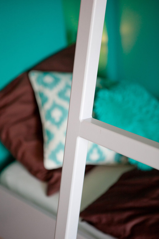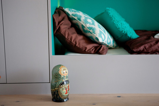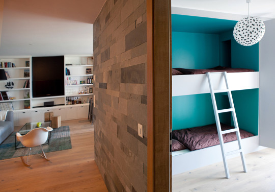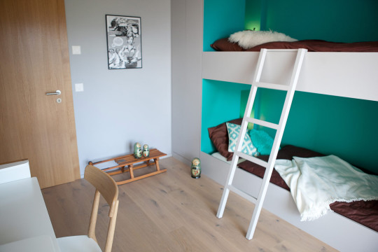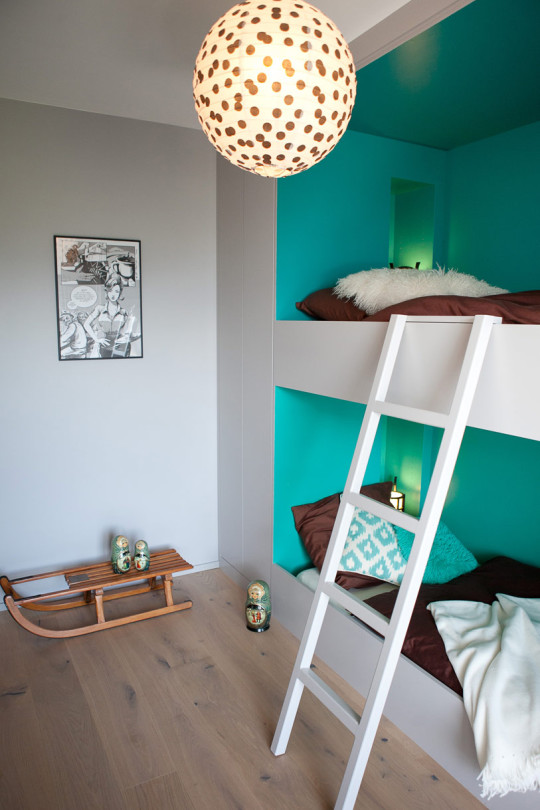 Des lits superposés, réalisés sur-mesure, viennent se nicher sur un côté de la pièce, dessinant des placards sans poignées de part et d’autres, et des petites niches de rangements en guise de chevets.