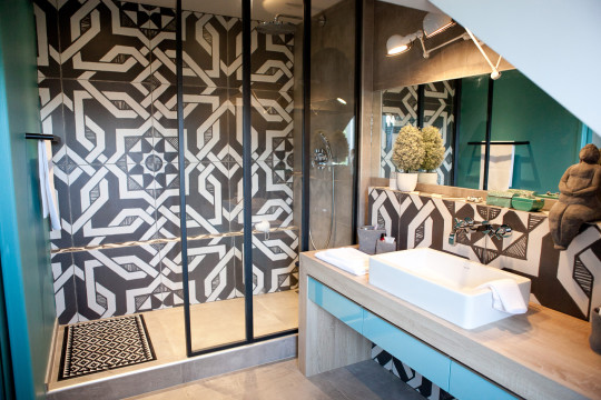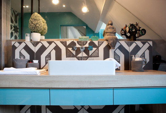 L’élément principal de cette salle de bain, c’est son carrelage aux motifs d’inspiration aztèque, dans un format XXL.