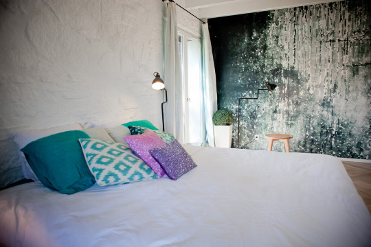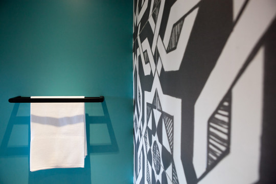 Au mur, un papier peint de chez Yoyo Design forme comme une toile abstraite