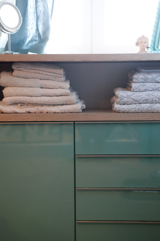 La salle de bain attenante s’ouvre sur un très grand meuble vasque réalisé sur-mesure, en chêne naturel et laque couleur lagon, lien avec la chambre.
