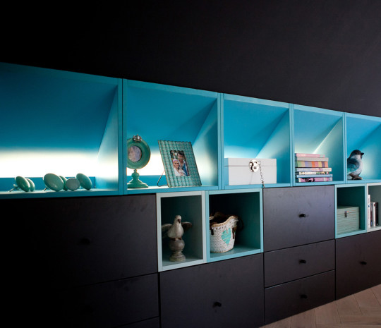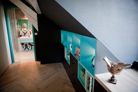 Tout le rampant, aménagé en niches rétro-éclairées et tiroirs aux formats multiples, vient dessiner comme un couloir jusqu’à la salle de bain.