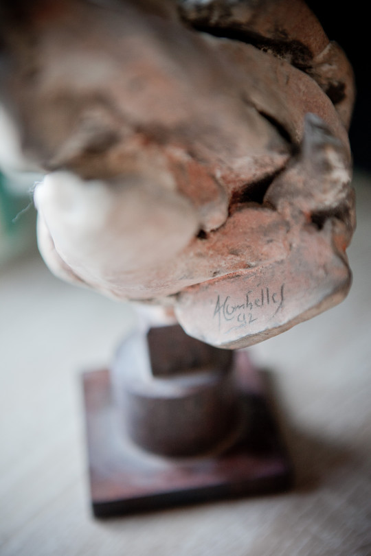 Les niches, déclinées dans un camaïeux de turquoises, se transforment en lieu d’exposition, où se côtoient livres d’Art, objets décoratifs et sculptures contemporaines (artiste Alain Combelles)