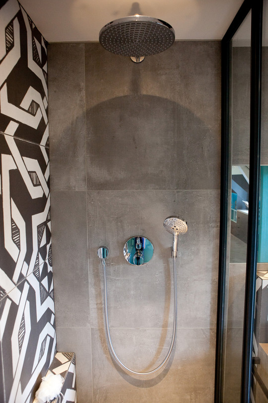 Utilisé pour mettre en valeur le fond de la douche à l’italienne et le meuble vasque, il est associé au sol et sur le reste des murs, à un grand carreau effet béton.