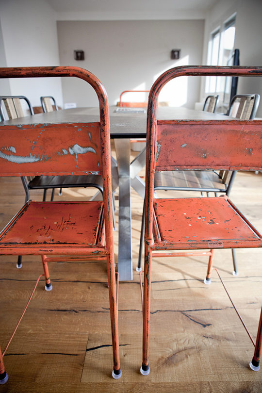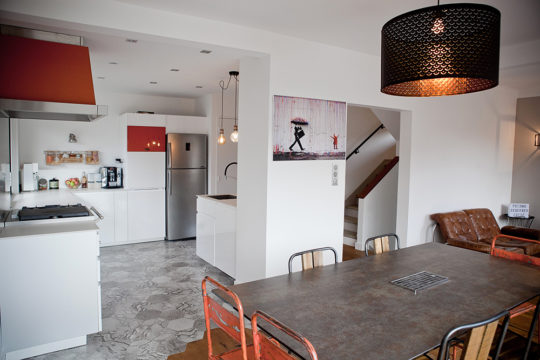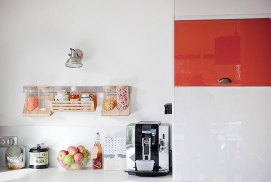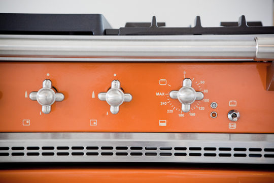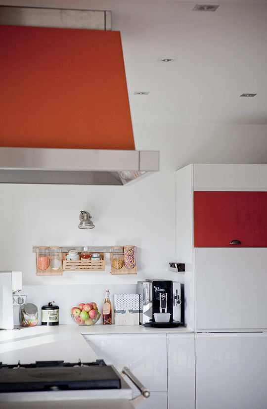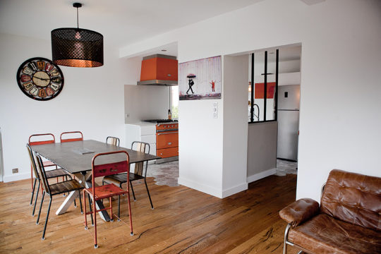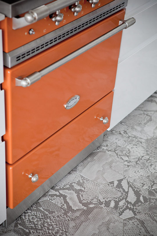 Un magnifique piano de cuisson orangé vient apporter de la couleur et de la bonne humeur à l’ensemble.