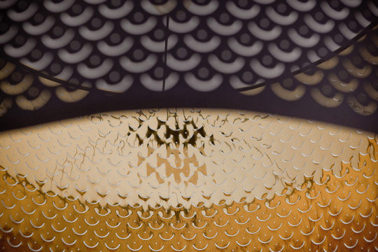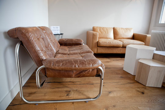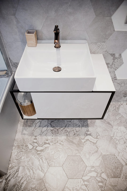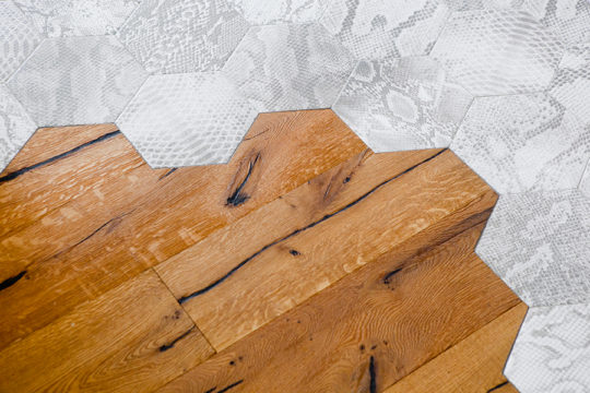La délimitation entre les différents espaces a été estompée par le mélange entre le sol en parquet et les carreaux hexagonaux aux motifs reptiles.