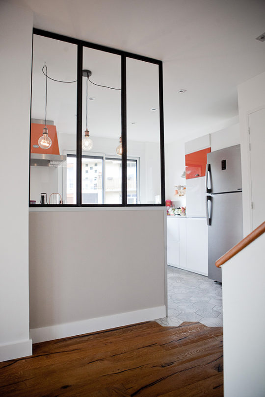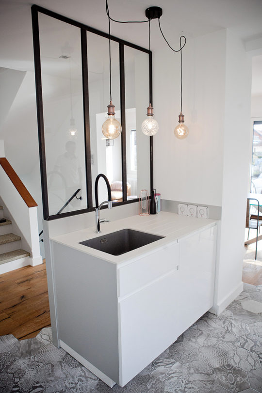 La surface au sol n’étant pas très grande, la décision a été prise d’ouvrir au maximum les volumes du rez. La cuisine a été ouverte sur le salon, récupérant ainsi toute la lumière naturelle de la pièce de vie, et ouverte en partie côté dégagement grâce à une 1/2 verrière noire, devenant un élément graphique devant le blanc immaculé de la cuisine.