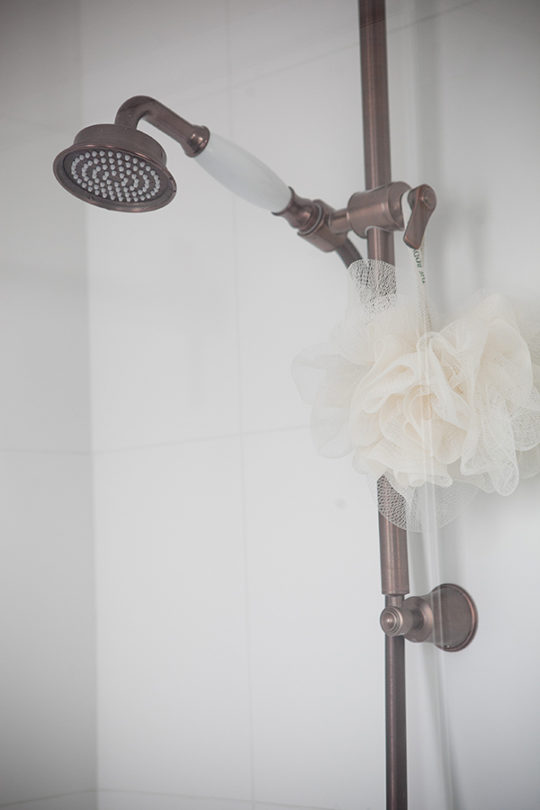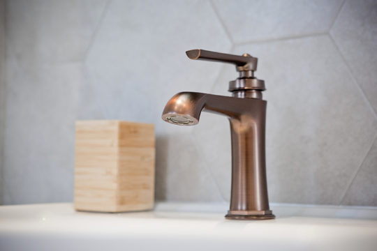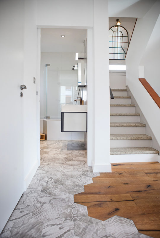 Le carrelage danse comme une vague de la cuisine à la salle de bain pour créer une belle harmonie de matériaux et d’ambiance.