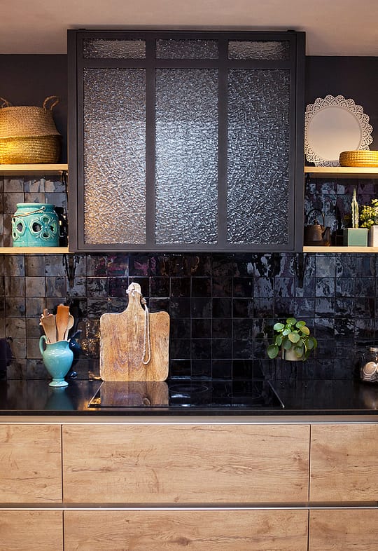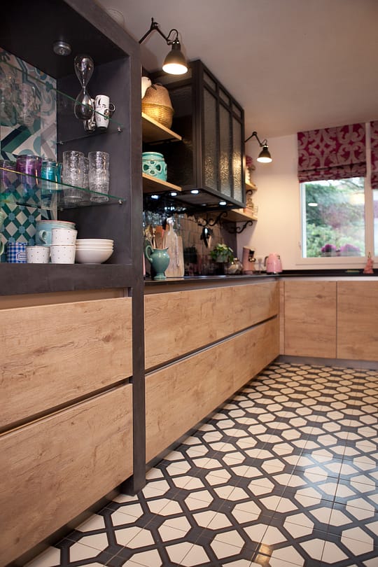 Associés avec une hotte rétro en verre cathédrale réalisée sur-mesure et des façades en bois brut, on créait un joli décor très personnel pour y concocter de bons petits plats.
