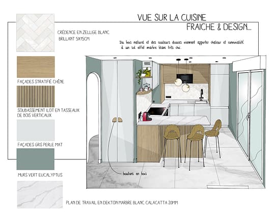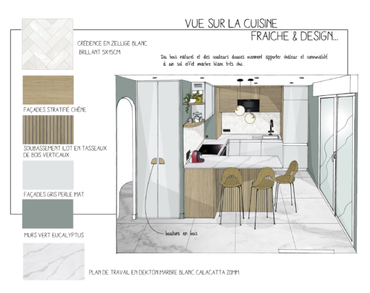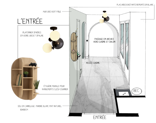 Le charme de l’ancien n’était pas vraiment au rendez-vous, alors nous l’avons recréé en dessinant ces 2 grandes arches visibles dès l’entrée pour une impression de douceur, et le grès cérame effet marbre au sol, vient également souligner la touche rétro.