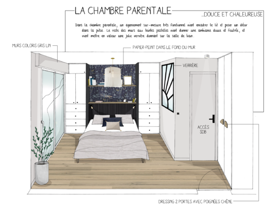 Dans la suite parentale, la salle de bain a été ouverte sur la chambre par une verrière au motif apaisant de coucher de soleil…